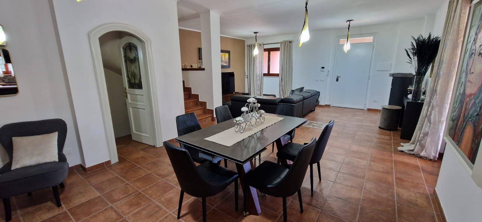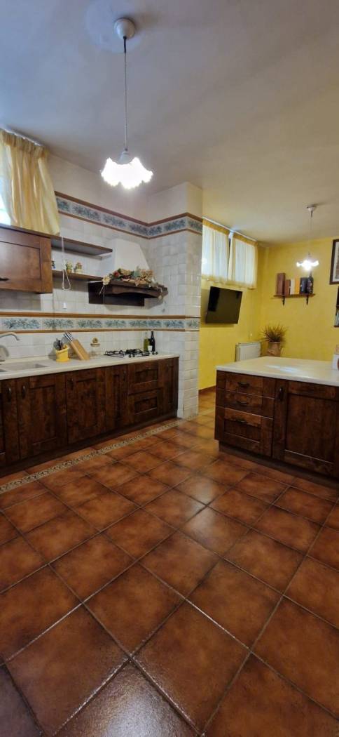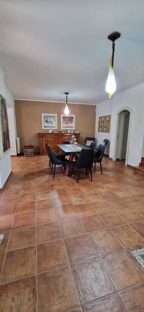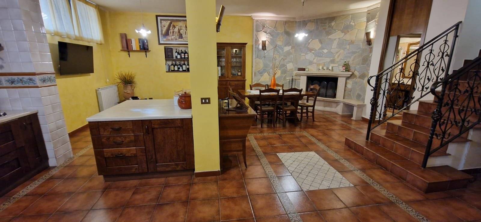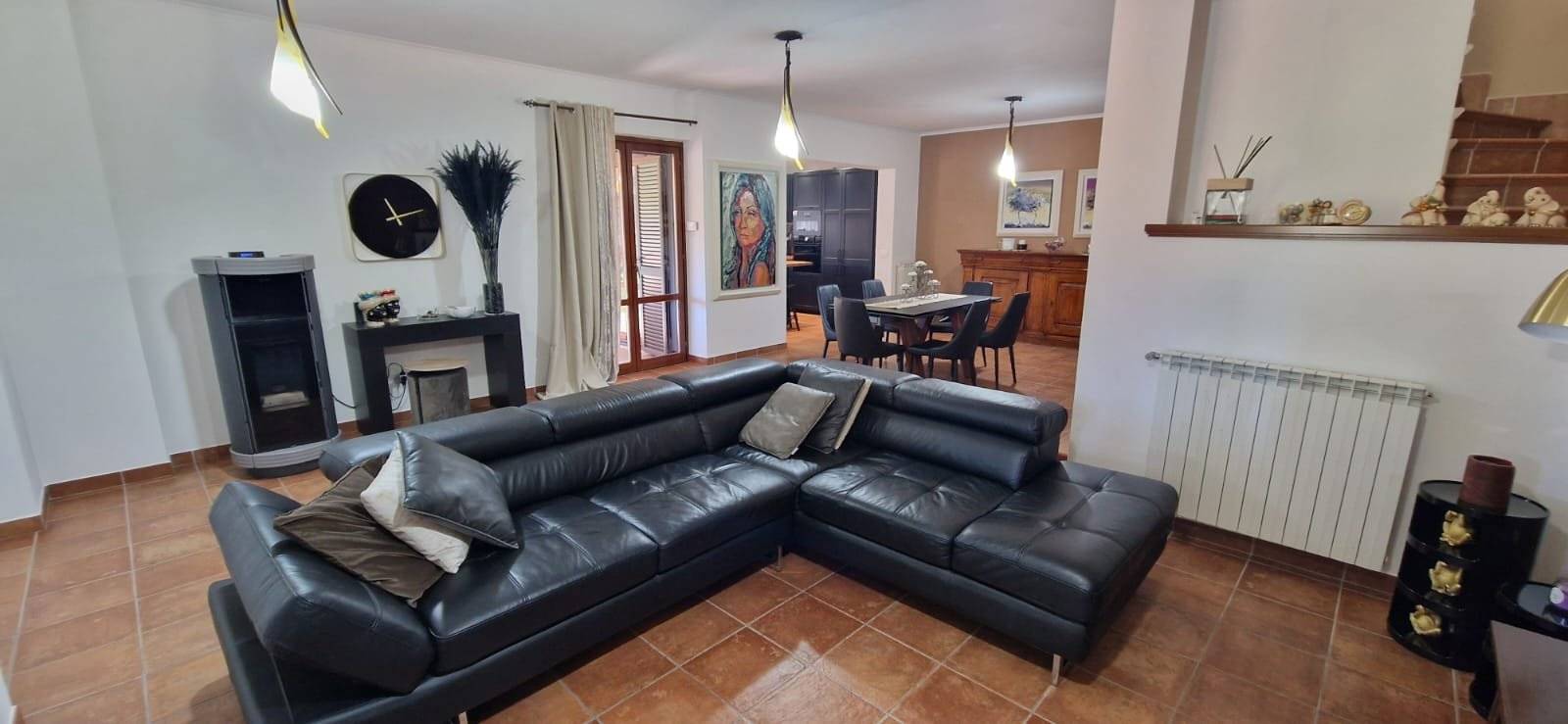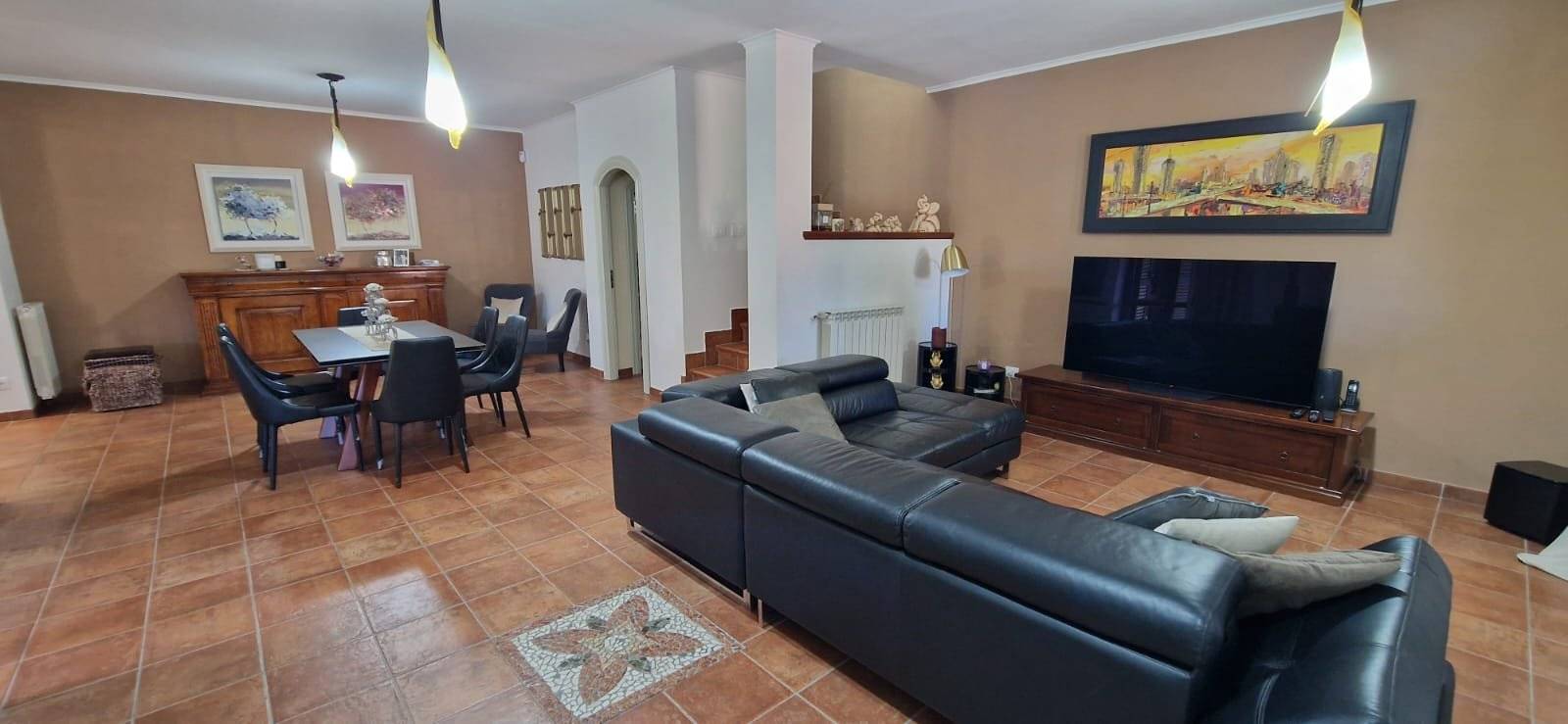 La villa di 270 mq, ideale per nuclei familiari numerosi grazie all'ampia metratura. E' situata in una zona molto centrale, vicino alla stazione dei Carabinieri, a 800 metri dal paese, offre un contesto residenziale piacevole e immerso nel verde, tranquillo ma non distante dai servizi di prima necessità. Costruita nel 1995, l'immobile ha l'ingresso principale nell'ampio porticato dove in primavera/estate è possibile mangiare all'aperto. Entrando dal portone corazzato, al piano terra, troviamo un ampio salone, una zona pranzo ed una cucina a vista, un antibagno e un bagno. Una comoda rampa di scale conduce al piano primo che ospita un disimpegno, due camere matrimoniali (possibilità di creare due camerette) ed un bagno. Al piano secondo mansardato troviamo un'ampia camera ed un ulteriore bagno.