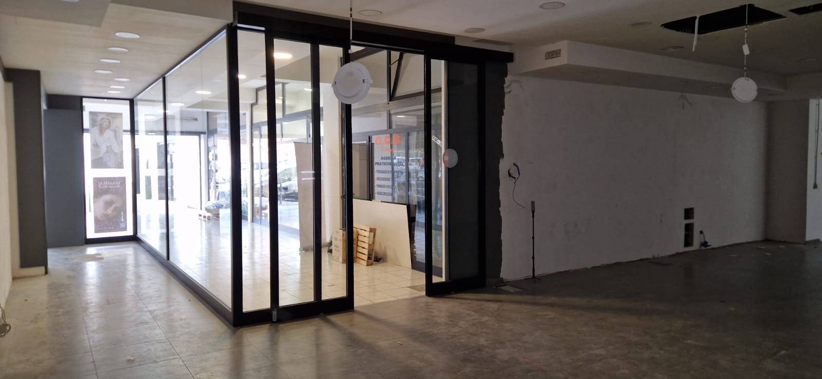 L'ingresso principale si apre su un grande open space, caratterizzato da un pavimento in gres porcellanato chiaro e da ampie superfici vetrate che garantiscono un'ottima esposizione verso l'esterno. Le tre vetrine fronte parcheggio e le due laterali, realizzate in elegante alluminio nero, offrono una visibilità ideale per qualsiasi attività commerciale o professionale che voglia presentarsi con impatto.