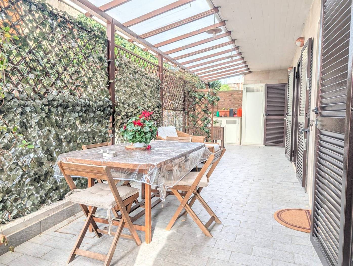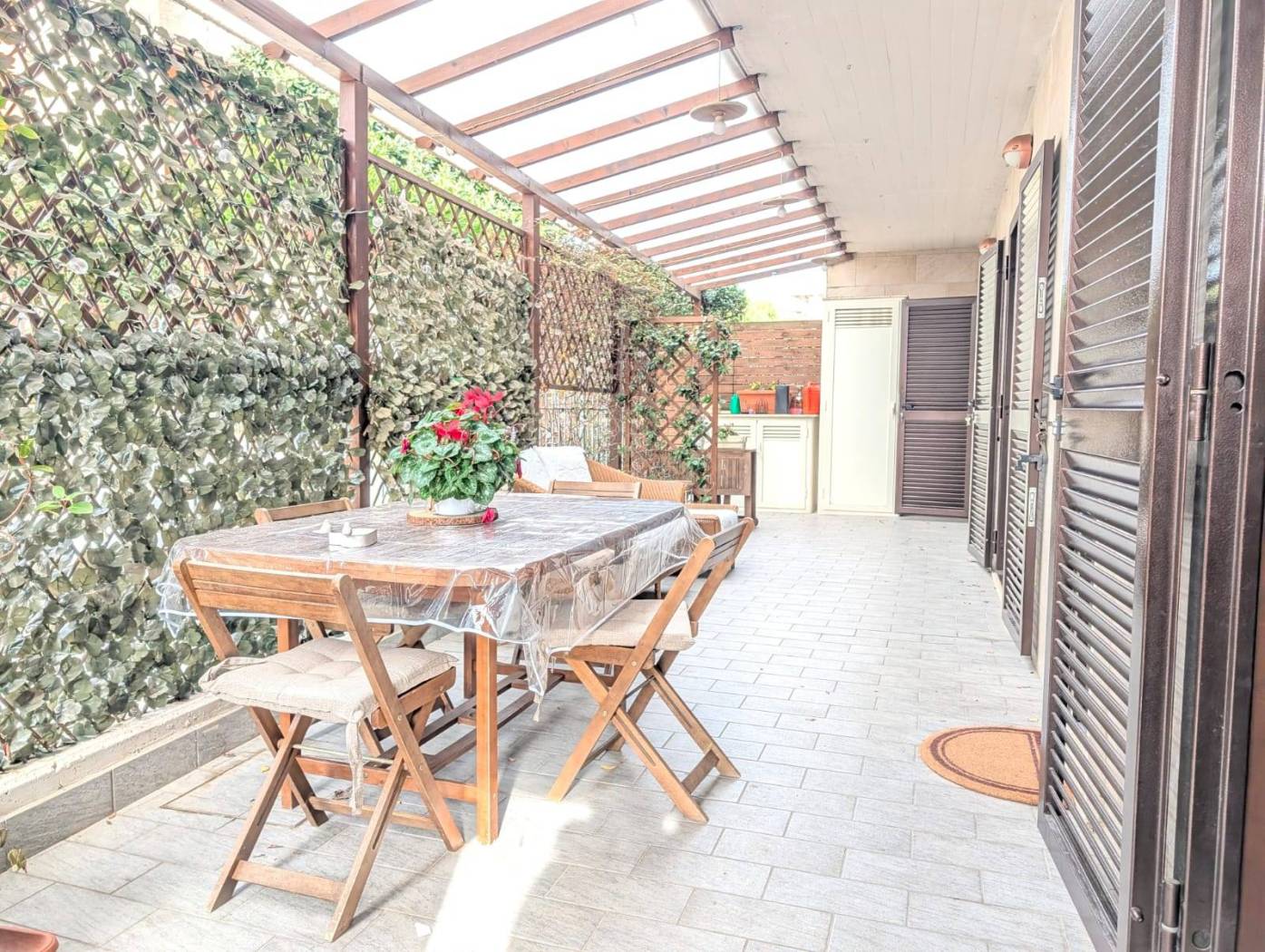L'immobile si sviluppa su una superficie complessiva di circa 65 mq ed è composto da soggiorno con angolo cottura, disimpegno, camera da letto matrimoniale, camera da letto singola, bagno cieco con vasca, ripostiglio con allacci lavatrice, giardino in parte pavimentato, in parte ad area verde, e corte pavimentata dove è possibile parcheggiare più autovetture.
